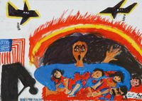 Ein Klageweib betrauert das Schicksal der Betroffenen im Irakkrieg. Zur gleichen Zeit wird über ihr das brennende Bagdad weiter von Bombern angegriffen. Die Statue von Saddam Hussein wird umgestürzt. |
